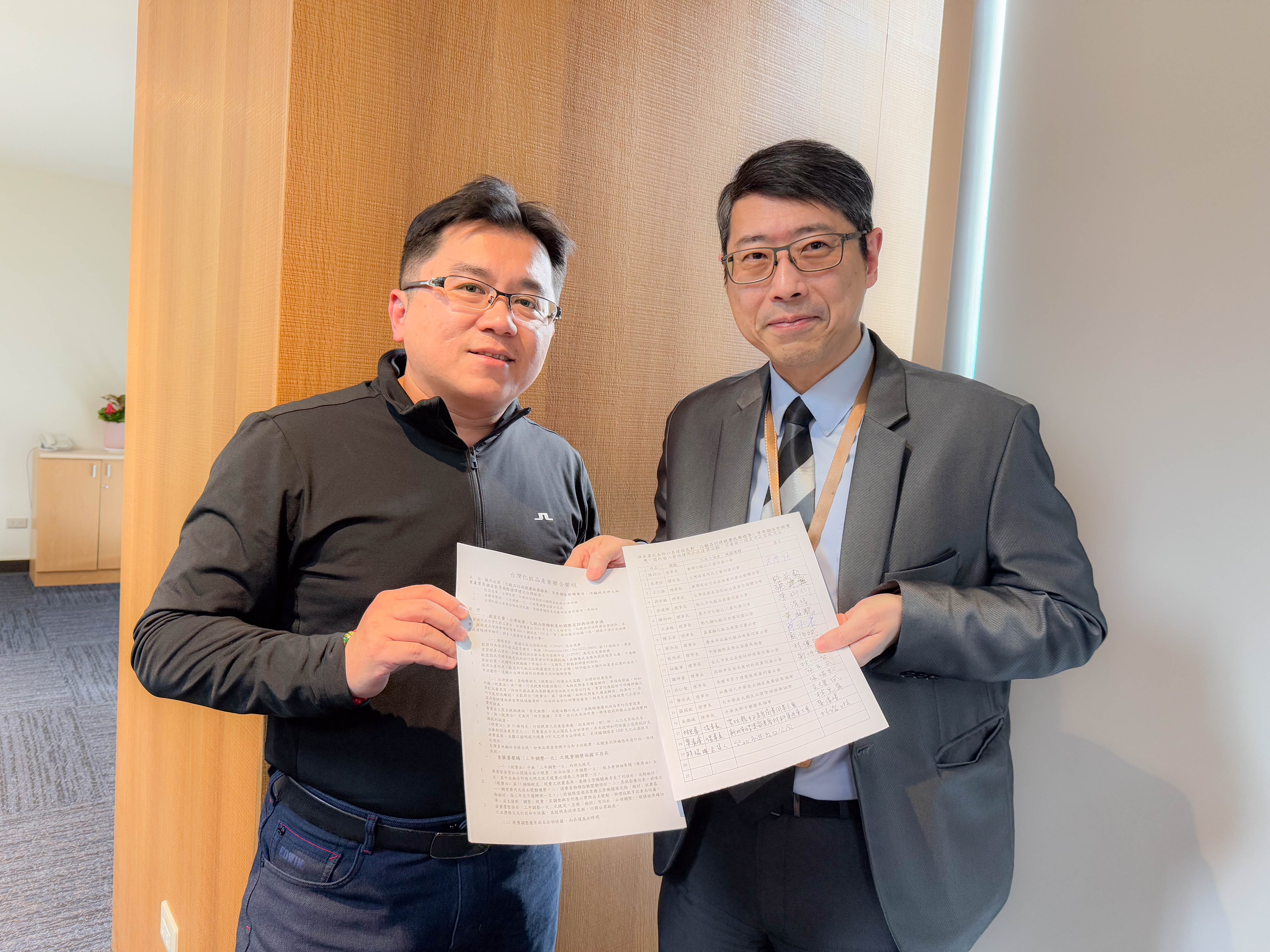 這份文件不僅是意見的彙整,更是產業意志的集結。在 2025 年 3 月的溝通會議現場,我們聯合多位產業公會理事長共同簽署,將業界對「化粧品登錄規費」與「制度合理化」的具體訴求,正式交付主管機關並送入行政處理軌道。